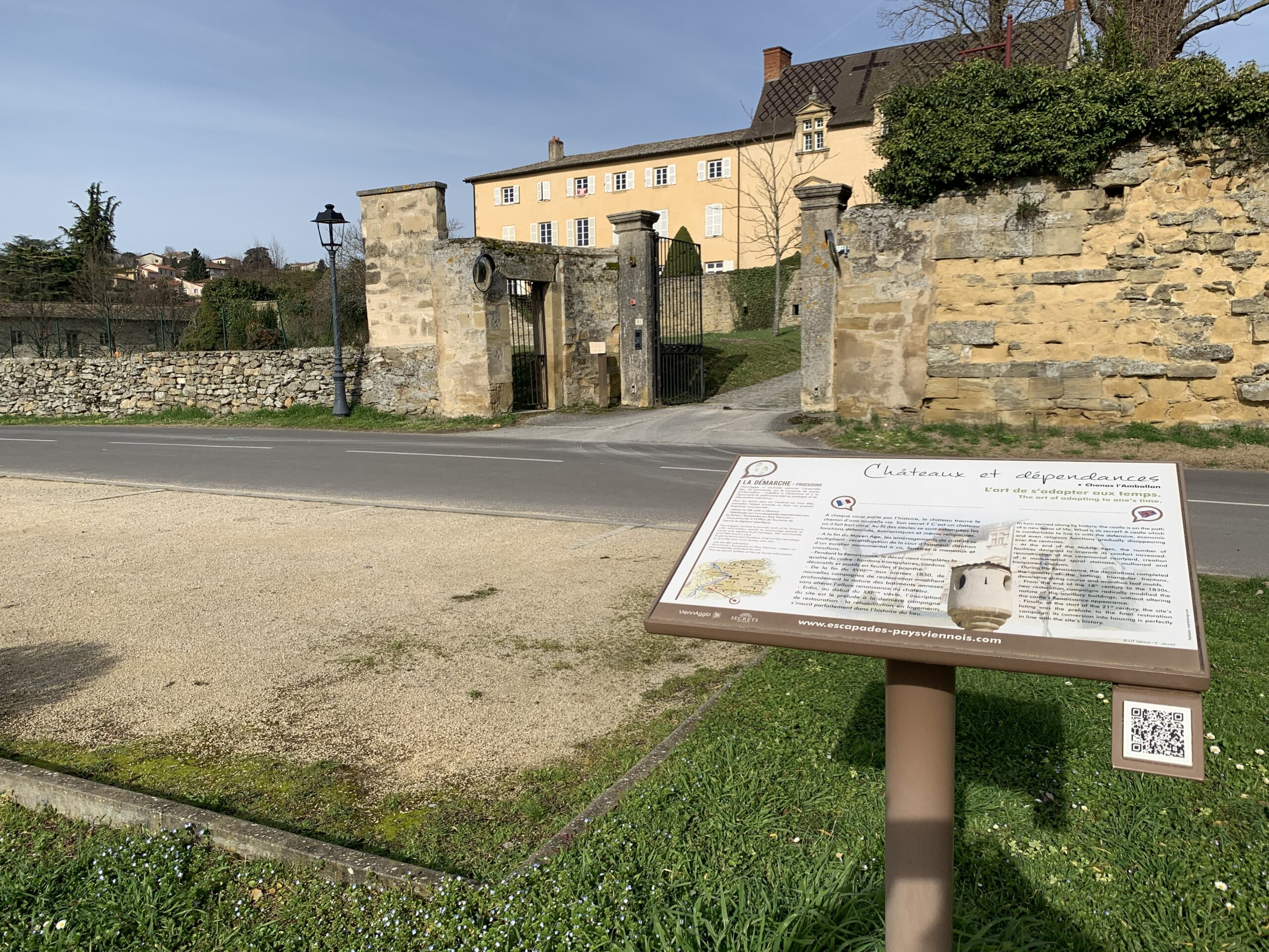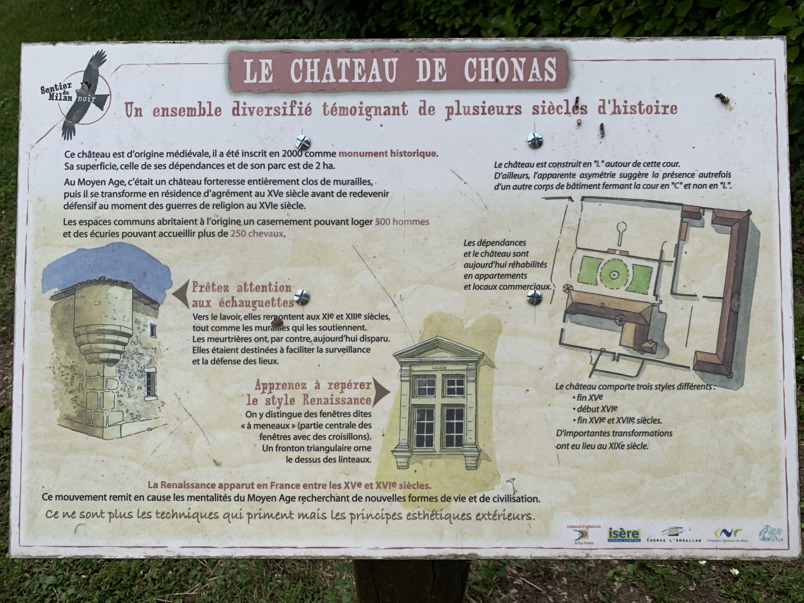 Devant la façade Sud, on peut apprécier la position dominante du château, commandant la plaine et la vallée de Reventin-Vaugris jusqu’à Auberives, avec une vue imprenable (zone non constructible) jusqu’aux premiers contreforts du Vercors.